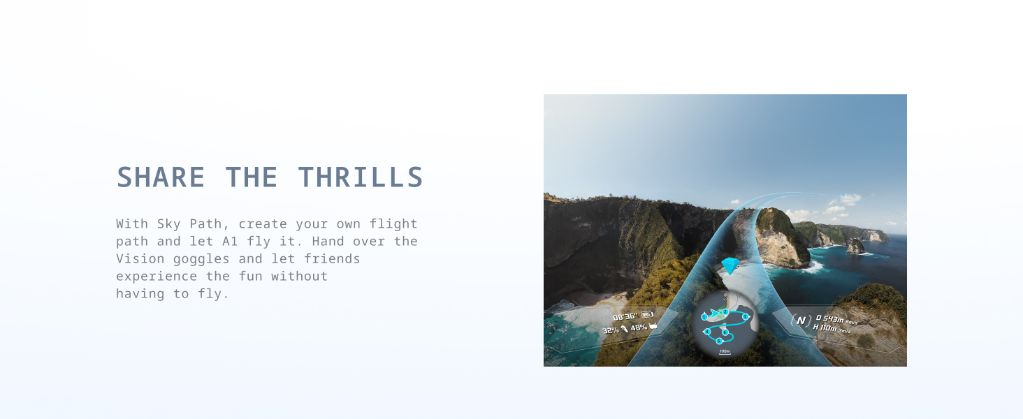 - Share the Flights with Sky Path – Create your own flight path and let A1 fly it. Hand over the Vision goggles and let friends experience the fun without having to fly. Turn a solo experience into a shared adventure.