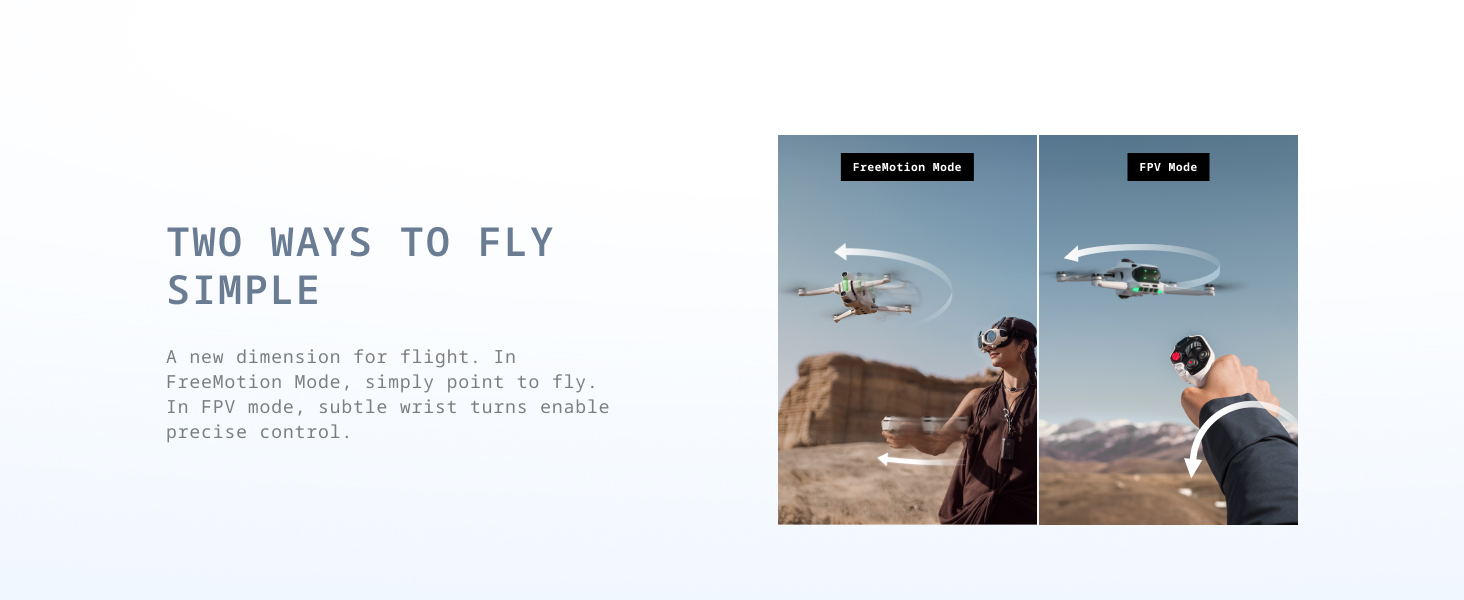 - Fly on Instinct, Easy to Master – Two control modes, a new dimension for flight. In FreeMotion mode, simply point to fly. In FPV mode, a subtle turn of your wrist translates into precise directional control. Intuitive, instant, and designed for everyone.