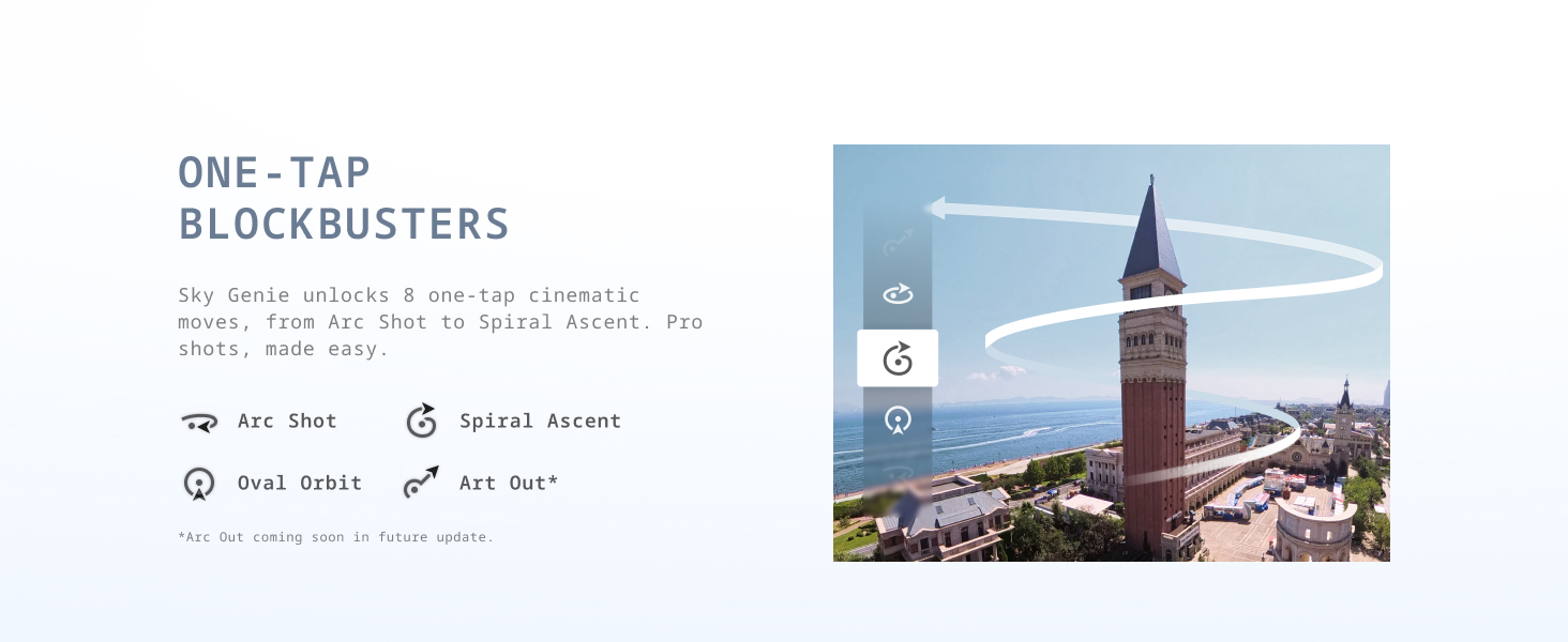 - Sky Genie – With Sky Genie, activate 8 advanced aerial moves like Arc Shot, Spiral Ascent, Oval Orbit — all with a single tap. Fly and frame your footage like a pro effortlessly. *Arc Out coming soon in future update.