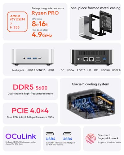 AOOSTAR MINI PC MACO Ryzen7 H255 Barebones mini computer,Dual DDR5 RAM and M.2 SSD Slots,Fingerprint unlock,Dual USB4+Oculink,8k Quad-screen display,2.5G RJ45*2,Desktop Gaming Office Home