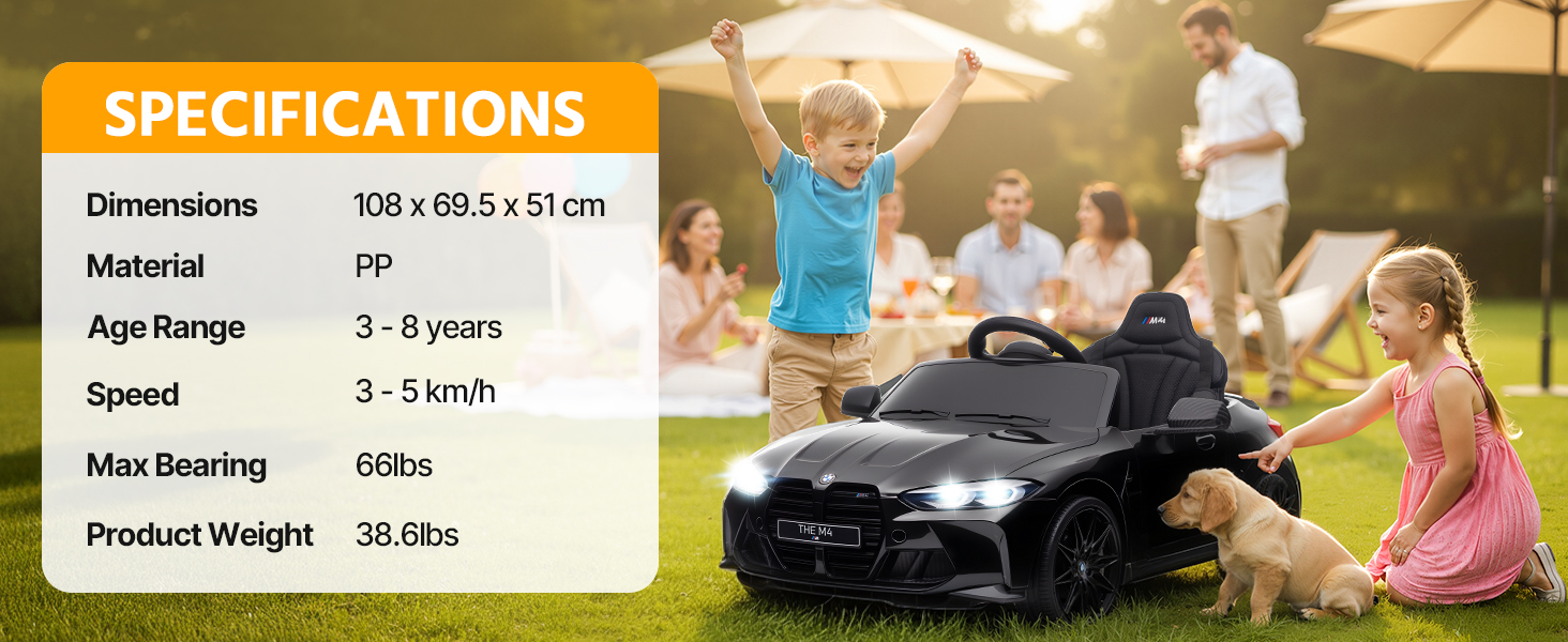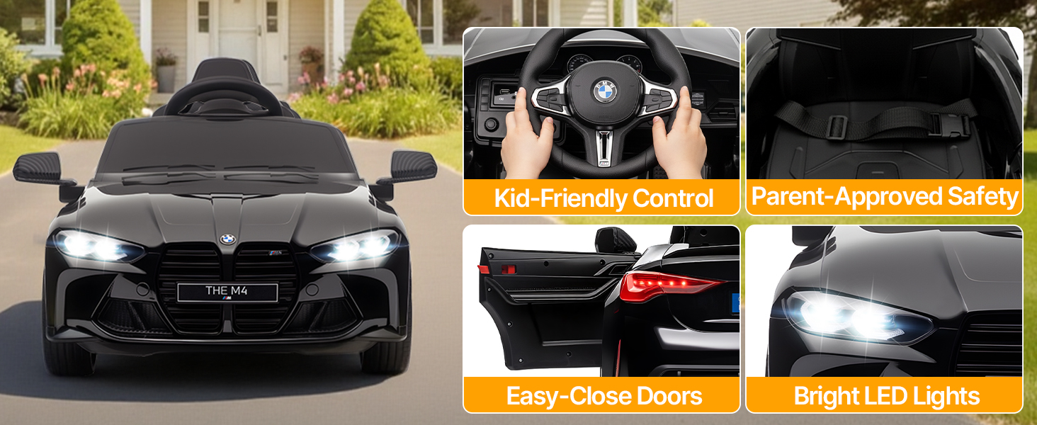 - Licensed BMW M4 Design: Features an authentic BMW M4 design with sporty details. Offers a realistic and exciting driving experience that sparks imaginative role-play