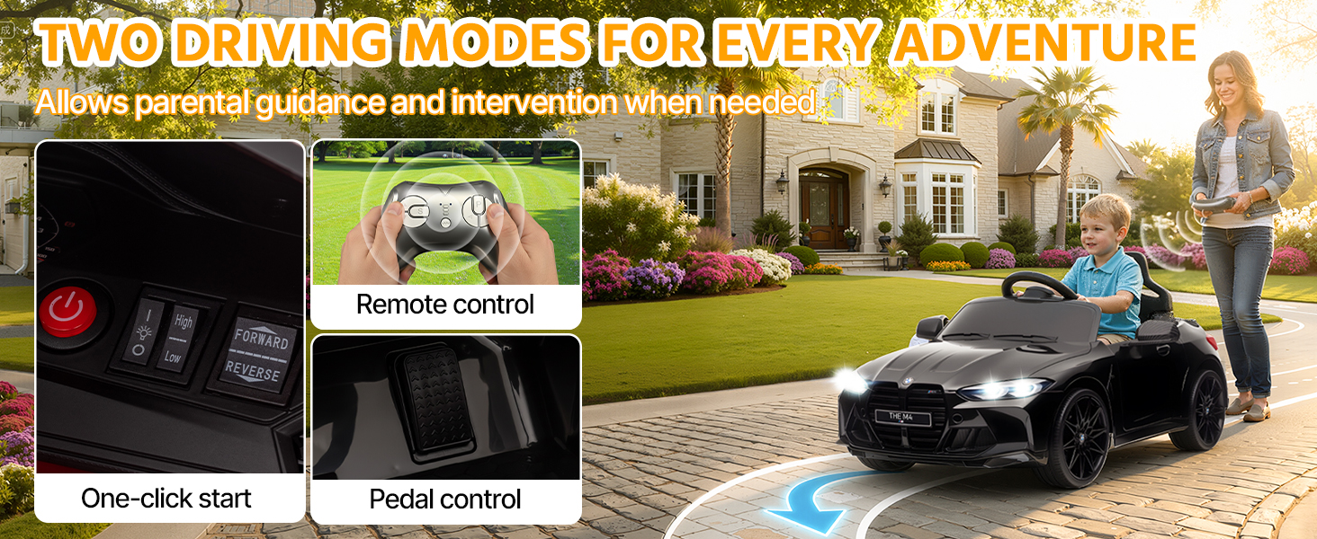 - Dual Driving Modes: Switch between parent remote control and child-operated steering. Ideal for teaching safe driving habits with parental supervision during outdoor and indoor adventures