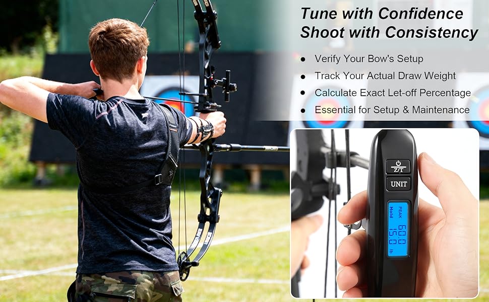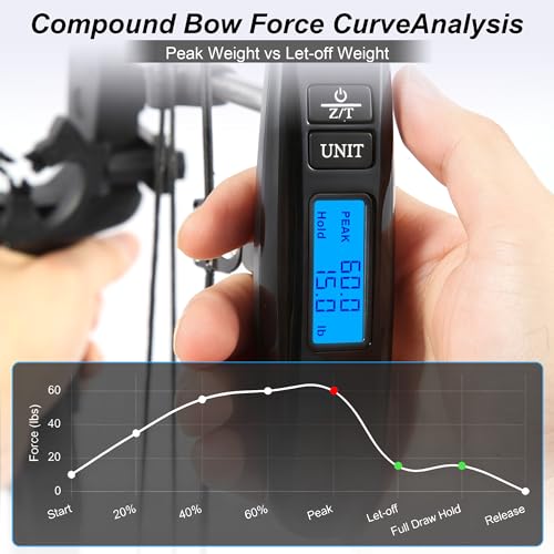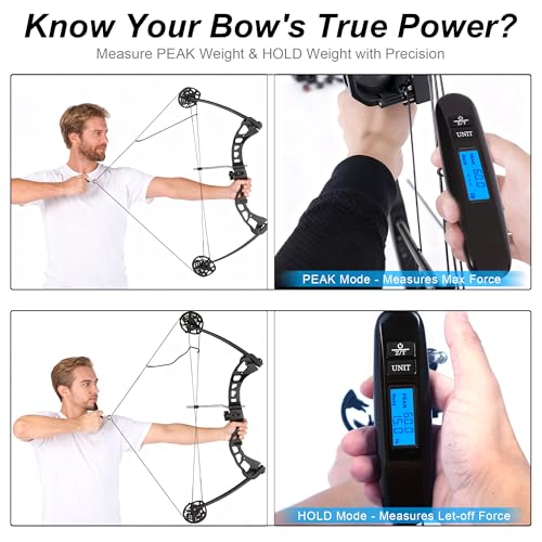 Simple Operation: Press the power button to turn on the LCD display;PEAK represents the maximum peak draw weight of the bow. HOLD represents the let-off weight for compound bows. Dual-value real-time display for both PEAK and HOLD measurements.The UNIT button allows switching between LB and KG units.