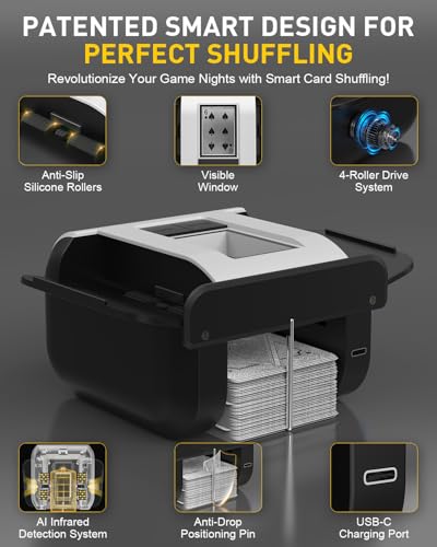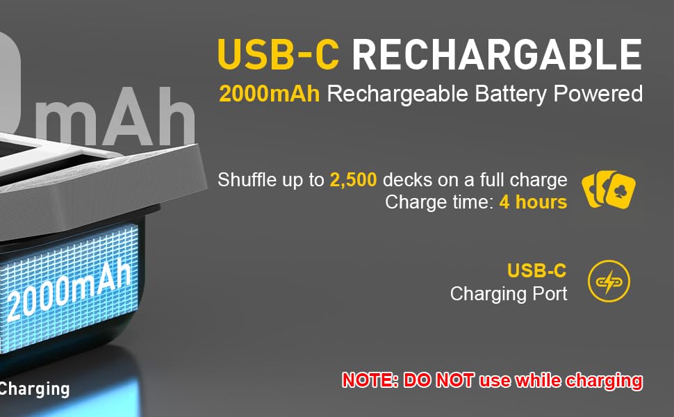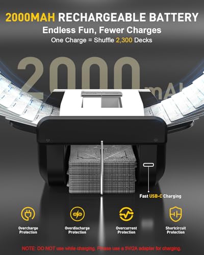 【Rechargeable Electric Card Shuffler, USB-C Fast Charging】Built-in 2000mAh rechargeable battery delivers up to 2,000+ shuffles per charge. Unlike battery-powered models, this electric card shuffler uses a USB-C port for fast, convenient charging—ready anytime for home games, parties, or travel.