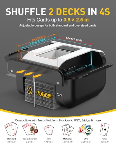 【Shuffles 1–2 Decks, Wide Card Compatibility】Designed as a card shuffler 2 deck model, it shuffles up to two decks at once. Retractable wings fit different card sizes. Compatible with Poker, Blackjack, Texas Hold’em, UNO, Phase 10, Skip-Bo and most standard cards—one versatile playing card shuffler for every game night.