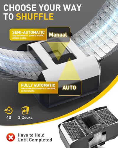 【One-Touch Automatic Shuffling, Hands-Free Control】This automatic card shuffler machine features dual modes: fully automatic for hands-free shuffling and semi-automatic for speed control. Smart sensors detect cards and stop automatically—no need to hold buttons like traditional models. A reliable electric card shuffler for poker nights and home casino play.