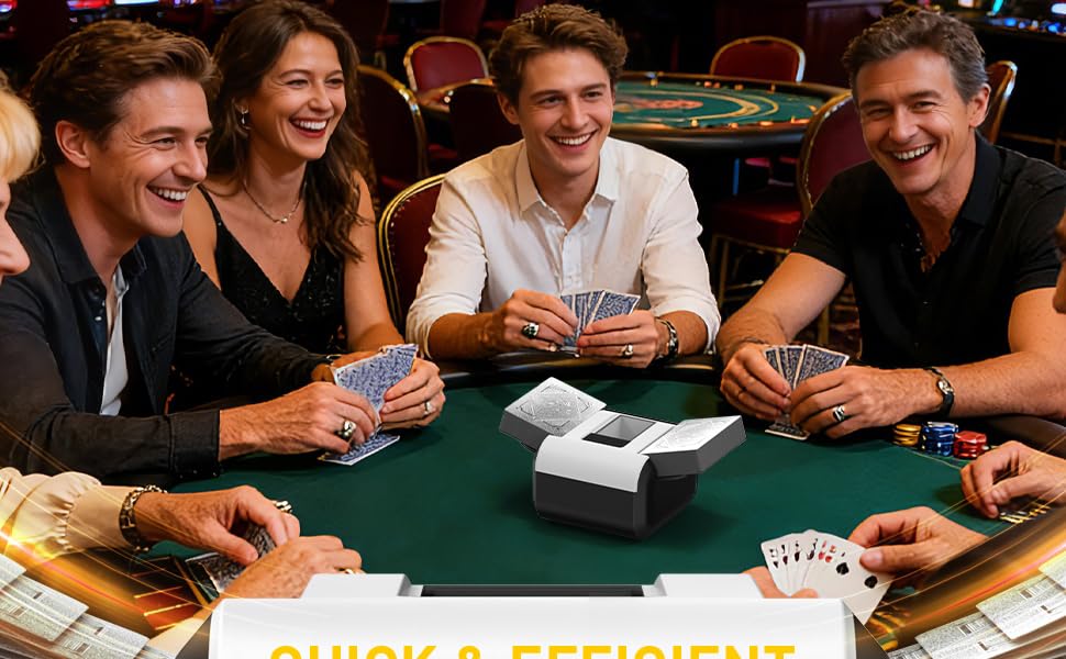 【Ultra Quiet, Smooth & Jam-Free Performance】Engineered for low-noise operation at around 65 dB, this auto card shuffler runs smoother and quieter than most casino card shufflers. The upgraded conveyor system prevents jams and protects cards from bending or damage, extending deck life.