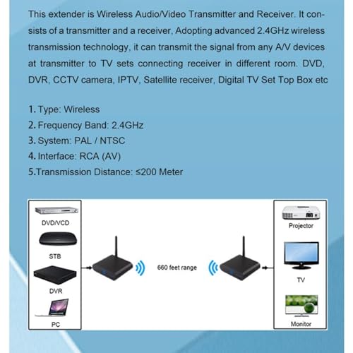 - Usage Range:This 200m range wireless AV transmitter transmits audio and video signals up to 200m (656ft) in open spaces, even through walls. However, some concrete walls may not penetrate, or may only reach 10m/32.8ft or less.