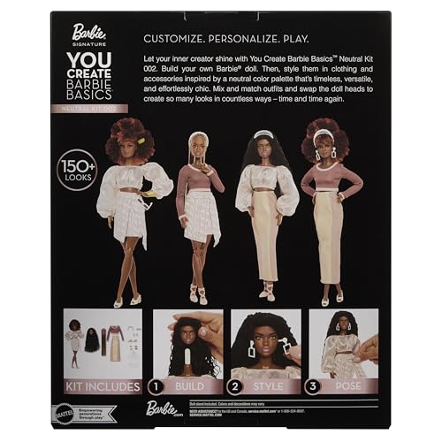 You Create Barbie Basics Neutral Kit 002 includes a doll with 2 additional, interchangeable heads, plus 4 clothing pieces, 2 pairs of shoes and 6 more styling accessories designed in neutral shades!