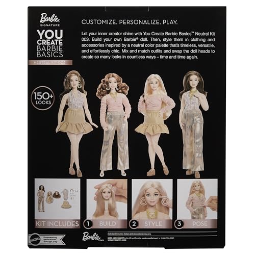 You Create Barbie Basics Neutral Kit 003 includes a doll with 2 additional, interchangeable heads, plus 4 clothing pieces, 2 pairs of shoes and 6 more styling accessories designed in neutral shades!