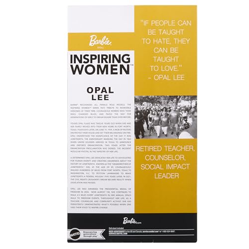 This Barbie Inspiring Women doll honors Opal Lee, the "Grandmother of Juneteenth." She has dedicated her life to advocating for positive change as a teacher, counselor, and community activist.