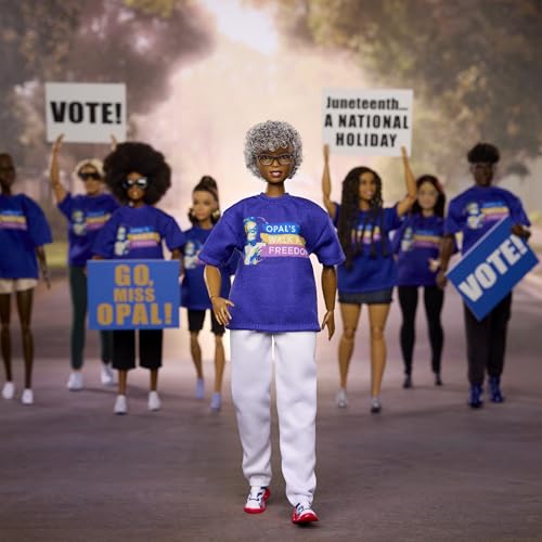 Barbie Inspiring Women Doll, Opal Lee Collectible in Blue “Opal’s Walk For Freedom” T-Shirt, White Pants and Glasses, Doll Stand And Displayable Packaging, JJX6
