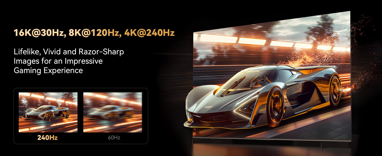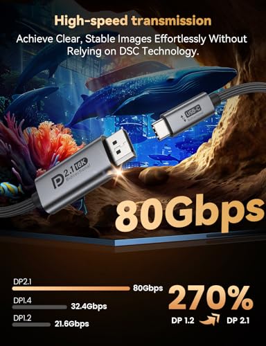 80 Gbps Bandwidth: Our USB C to DisplayPort 2.1 cable supports a bandwidth of 80 Gbps, enabling high speed video and image transmission. This significantly reduces signal loss, minimises image tearing and lag, and ensures efficient and stable data transfer. Thanks to its support for VRR, FreeSync and UHBR10, it works 23% faster than DisplayPort 1.4, offering gamers a smooth gaming experience in high definition.