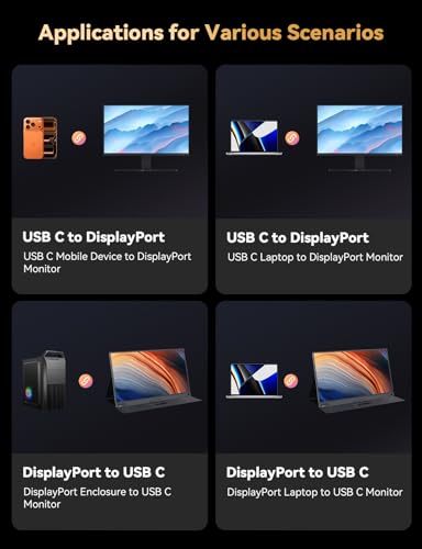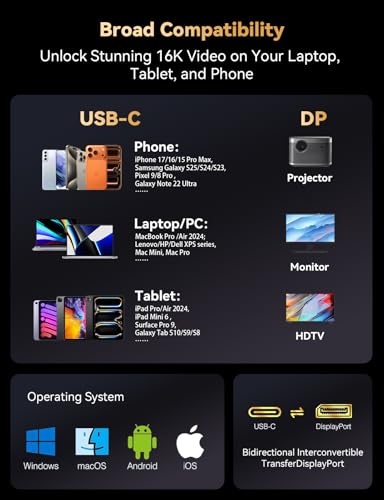 Wide Compatibility: The USB C to DisplayPort 2.1 cable works with DP Alt Mode enabled devices and most monitors/projectors. The USB C DP 2.1 cable is compatible with most devices, including laptops, smartphones, tablets and desktop DP computers, such as the iPhone 17/16/15 series, MacBook, iPad Pro, Galaxy S25/S24, RTX 5090/5080/5070/5060, RTX 4090/4080/4070/4060, and Steam Deck. *Note: 1、This DisplayPort cable only works with USB 3.2 Type-C ports, Thunderbolt 4 ports, or thunderbolt 5 ports which support DP Alt Mode. 2、Portable monitors require an additional USB PD power supply.*