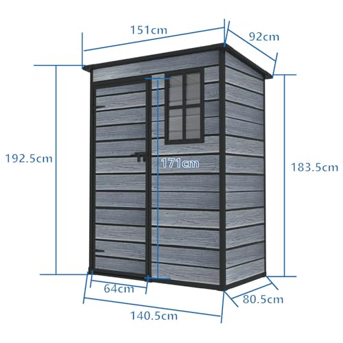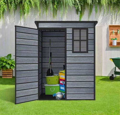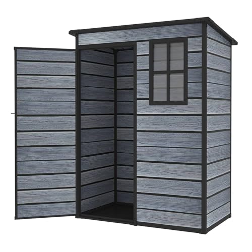 BIRCHTREE 5X3FT Plastic Garden Shed with Floor Pent Roof Wood Grain Effect Fade Free All Weather Resistant Lockable Door Outdoor Storage Box Air Vent&Window Garden Tool Shed Low Maintenance Grey