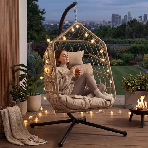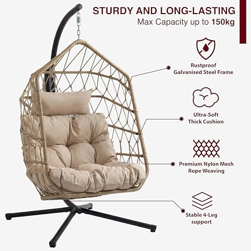 Blisswood Swing Egg Chair for Indoor & Outdoor use – Hammock Hanging Rattan Egg Chair with Cushion, Foldable Stand Wicker Pod Chairs for Garden, Patio or Balcony – Upto 150kg Weight Capacity (Natural)