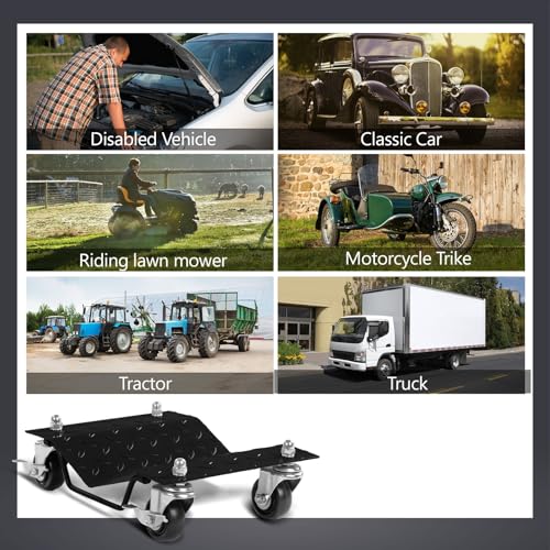 - [Heavy-Duty Construction]: Made from thickened steel plates, this 4 – wheel mover set has a total capacity of 2720 KG (680 KG per wheel). Easy to use and do an effective job of moving vehicles around a garage or storage space without too much effort.