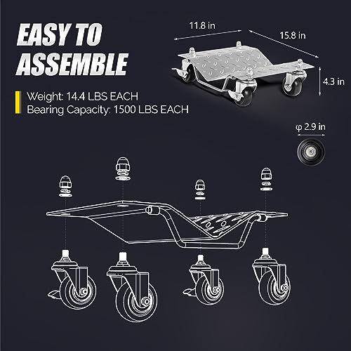 [Heavy-Duty Construction]: Made from thickened steel plates, this 4 – wheel mover set has a total capacity of 2720 KG (680 KG per wheel). Easy to use and do an effective job of moving vehicles around a garage or storage space without too much effort.