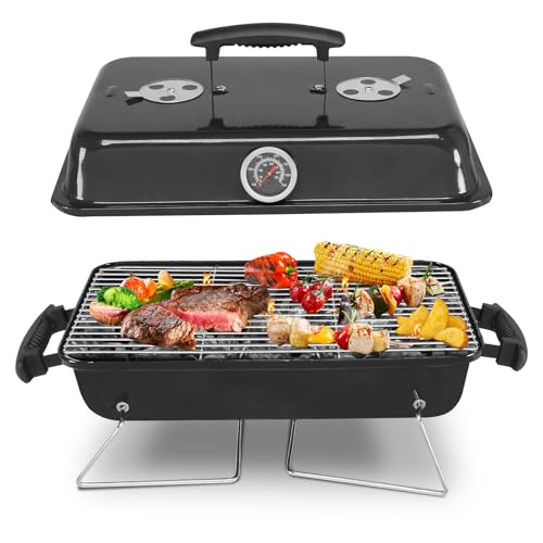 Bonnlo Portable Charcoal Grill with Handle, Metal Compact Tabletop BBQ Grill with Thermometer, Outdoor Cooking Barbecue for Camping, Travel, Picnic & Patio Use – Black