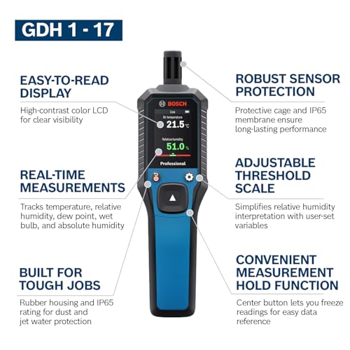 Bosch Professional Thermo-Hygrometer GDH 1-17 (Real-time Readings, High Contrast Color LCD Display, IP65 Rating, Rubber housing, 2X AA Batteries, Pouch)
