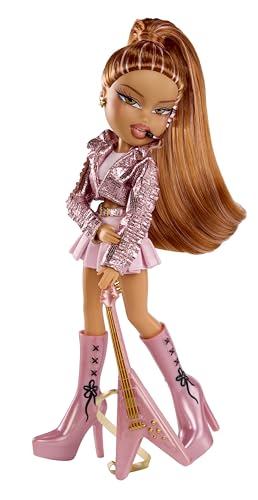 - WHAT'S INCLUDED: One Bratz Pop Starz fashion doll, jacket, shirt, skirt, pair of boots, guitar, headset microphone, pair of earrings, charm, hairbrush and album