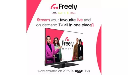 Transform your evenings into cozy experiences with the Bush Smart HD Ready TV Powered by TiVo with Freely. Enjoy crisp HD resolution with HDR10 for vivid colours and sharper detail, plus immersive sound from DTS X and Dolby Audio. With Freely, stream, watch and enjoy live and on-demand TV over Wi-Fi — making great entertainment easier than ever. Model number: 32HT25CB. 2025 model. Dimensions and Weight Screen size: 32 inches. Size of TV H43.1, W72.8, D7.6cm. Size of TV with stand: H47.5, W72.8, D18.5cm. Width of TV stand 38.5cm. Weight of TV without stand 4kg (unpackaged). Weight of TV with stand 4.5kg. Suitable for wall mounting 75 x 75 bracket. Length of cable: 1.5m. Packaged size H52.7, W79.9, D13.5cm. Packaged weight 5.58kg. Screen Technology LED TV Screen. HD Ready display resolution. HDR. HDR10. HLG. Motion rate 50Hz. Viewing angle 178/178 degrees. Resolution 1366 x 768 pixels. Sound Technology 2 x 6 watt RMS power output. Connectivity 1 USB port and 2 HDMI sockets. Headphone socket. Built in Wi-Fi. Ethernet connection. Smart TV features TiVo operating system. Compatible with the following smart apps: Disney+, Netflix, BBC iPlayer, ITV Hub, My5, All 4, Amazon Prime, YouTube. Internet browser. Miracast. Additional features Features USB media playback. Freely digital tuner. Freely. Saorview digital tuner (Saorview can only be received in the Republic of Ireland). Quad core processor. CI plus slot. Sleep timer. Parental controls. Aerial not required. Energy efficiency information: Energy efficiency class: E. Energy consumption per 1000h: 26kWh. Energy consumption in high dynamic mode per 1000h: 45kWh. Annual power consumption 26kWh. Standby power consumption 0.5 watt. In the box TV. Remote control (requires 2 x AAA batteries, included). Power cable. TV stand. Screws. Also in the box: AC Power Cable, Quick Start Guide, Instruction Manual.