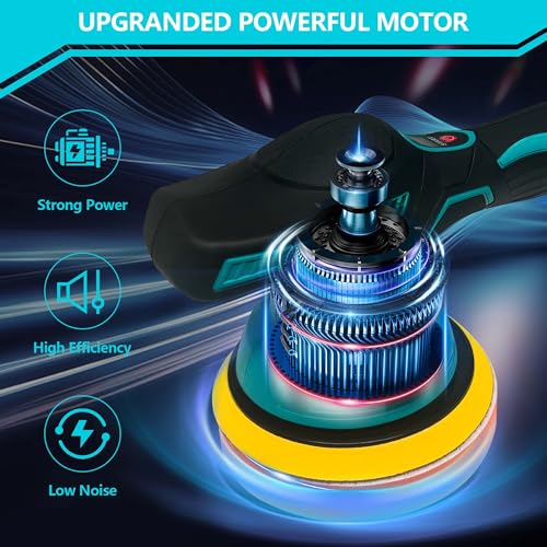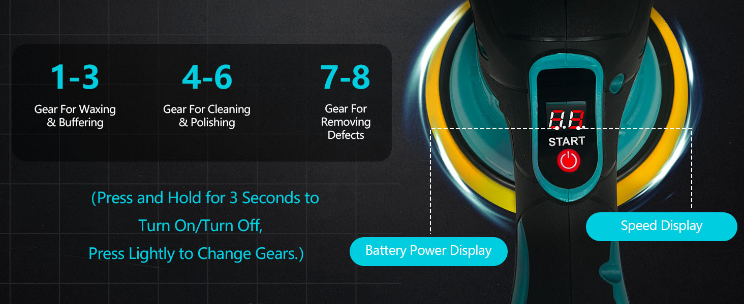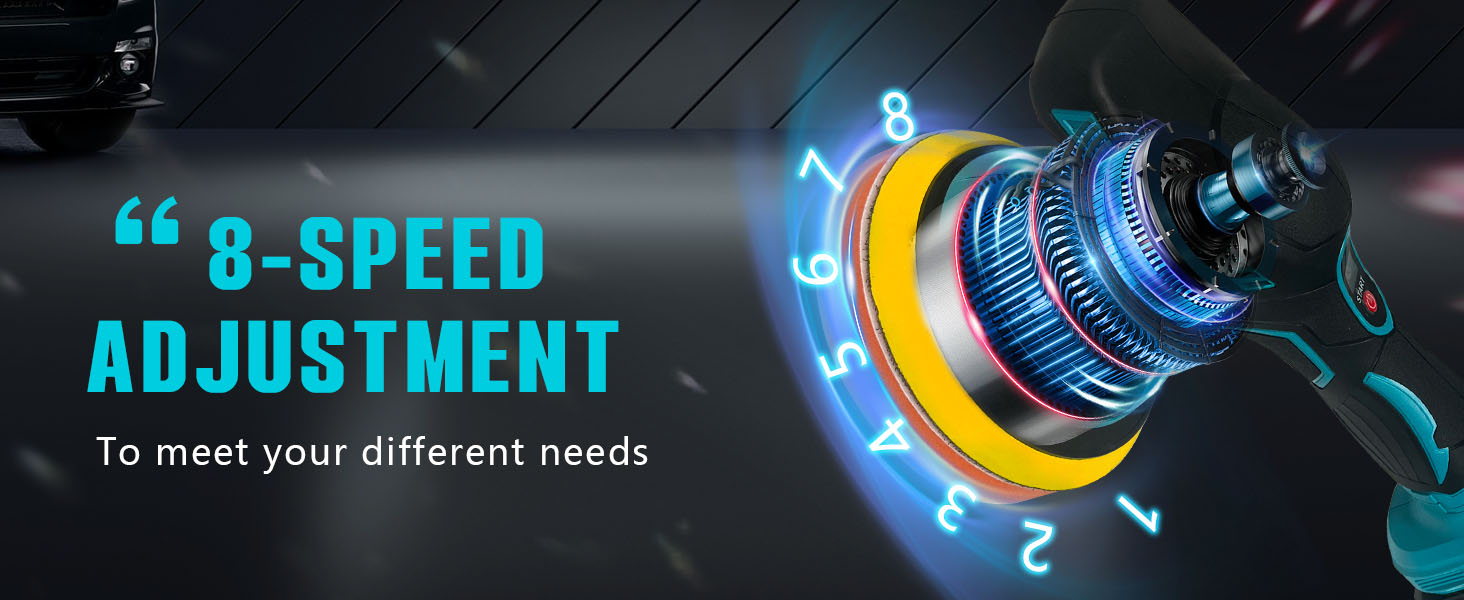 - 【8 VARIABLE SPEED】— Our cordless car buffer polisher features 8-speed adjustments, ranging from 550 to 5000RPM. The low speed is suitable for waxing and buffing, the medium speed for polishing and cleaning, and the high speed for removing paint defects and oxidation. This cordless car polisher ensures that it can meet your needs whether you're dealing with delicate surfaces or demanding correction tasks