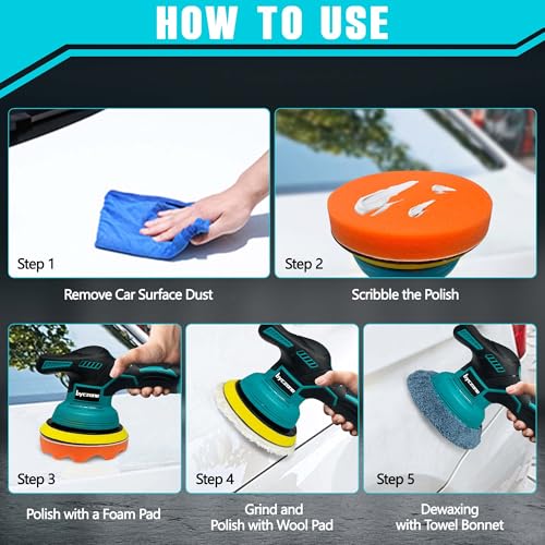 - 【WHAT YOU WILL GET】— The car buffers and polishers kit includes 1 x cordless polisher (battery not included), 3 x flat sponge pads ,3 x waffle sponge pads ,2 x wool pads ,8 x polishing bonnets ,6x sandpapers ,1x carry storage bag ,1xmicrofiber cleaning cloth ,1x apron and non-slip gloves. If you have any questions or doubts please feel free to contact us directly our service team will reply within next 24 hours