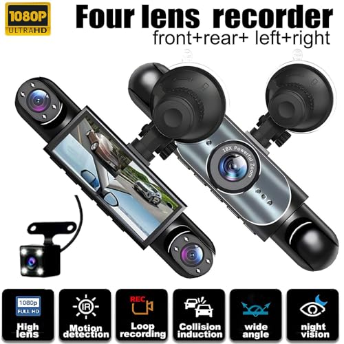 Car Dash Cam – Quad Channel Battery-Operated Recorder, Front, Rear, Left, Right 1080p Camera, Motion-Sensing Parking Monitor, Loop Recording Security Device, Night Vision Driving