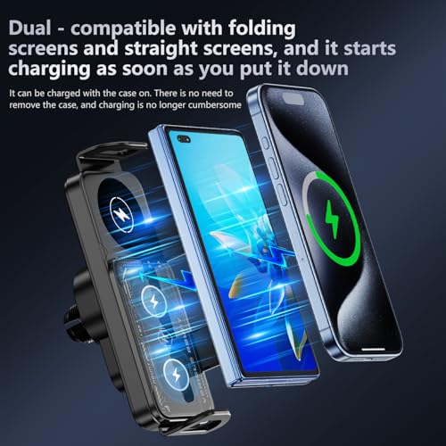 Car Phone Holder Wireless Charger – 15W Fast Magnetic Foldable Screen Mount, Auto-Clamp & One-Touch Release for Most Smartphones in Car/Truck/SUV (Vent + Dash Mount)