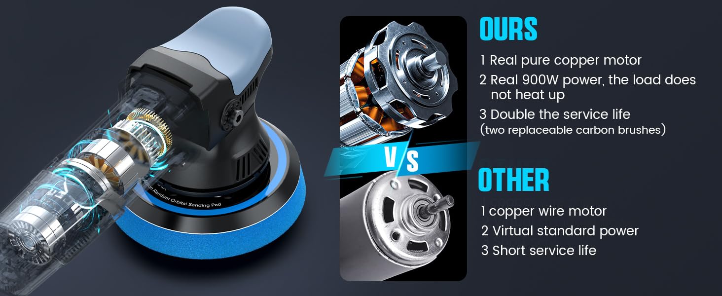 POWERFUL MOTOR: This buffer polisher equipped with a truly powerful pure copper motor, which extends motor lifespan. The 9mm eccentric motion ensures a larger contact area, Combines rotary and orbital motions to polish effectively while reducing paint burn risks, making this dual action polisher ideal for both beginners and pros