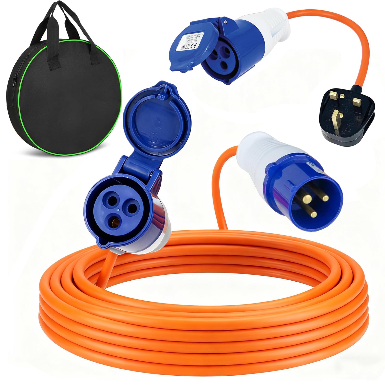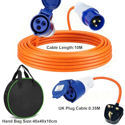 Caravan Hook Up Cable 10M, 240V 16A Camping Extension Lead with 3 Pin Fly Lead Converter and Carrying Bag, Power Cord Electric Extension Cable for Motorhomes Campervans