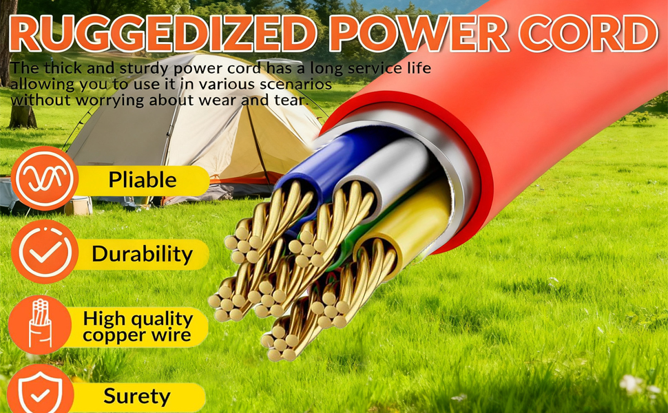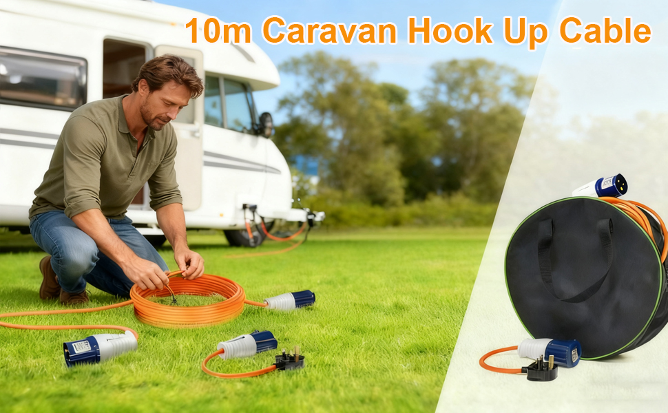 【Easy to Carry】: You not only get a 10m electric hook up cable with a 3-pin plug, but also a socket adapter, and an handbag (size 28 × 28 × 10cm), which is convenient for you to carry the hook up cable with you and store it when you go out.