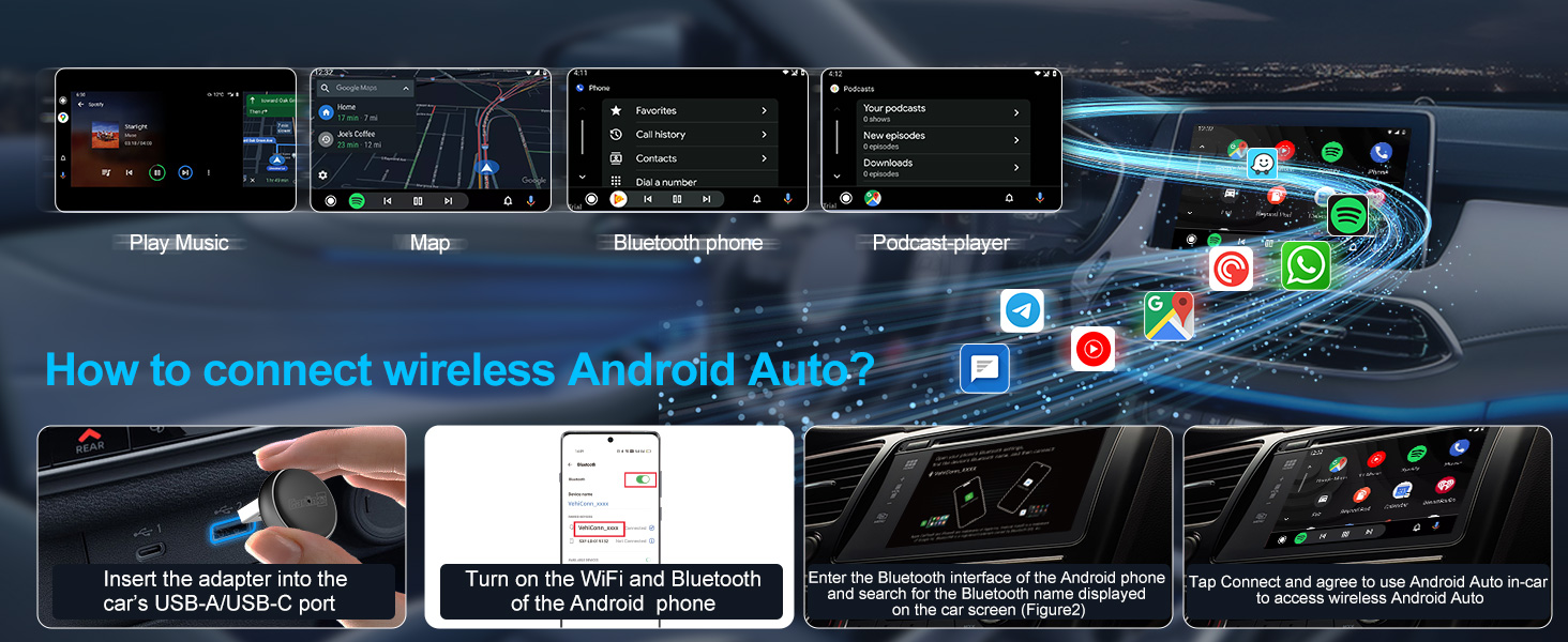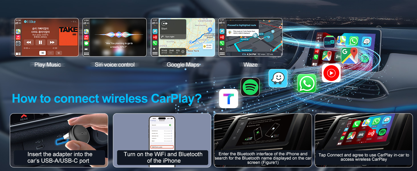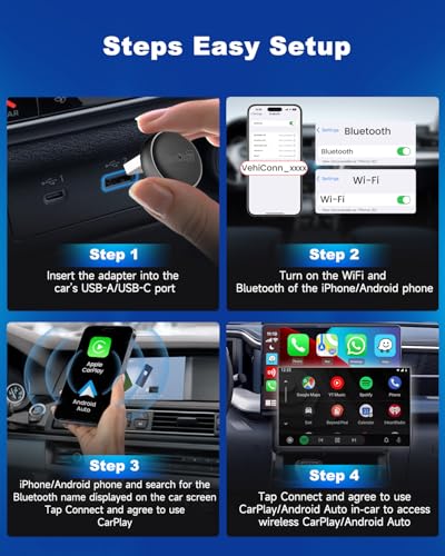 Plug & Play Setup: Simply plug the adapter into your vehicle's USB port (includes Type-C converter), follow the quick one-time pairing process on your phone, and thereafter enjoy automatic, wireless connectivity every time you start your car