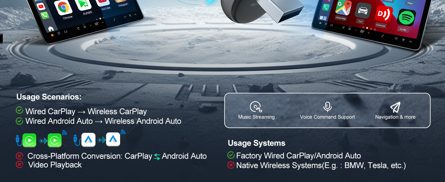 Wireless Freedom & OEM Compatibility: This adapter is specifically designed for vehicles with Factory-installed wired CarPlay or Android Auto. It converts wired CarPlay to wireless CarPlay and wired Android Auto to wireless Android Auto. Please Note: it cannot cross-convert between ecosystems (e.g., CarPlay to Android Auto)
