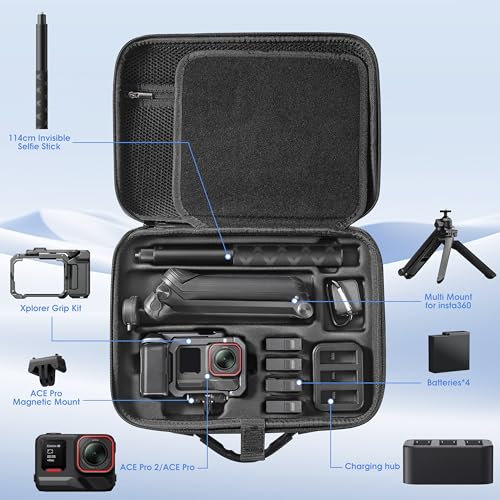 Large Storage Capacity: can store 114cm invisible selfie stick, Ace pro/Ace pro 2 camera set with Xplorer grip kit (with magnetic base), charging hub, 4* batteries, for Insta360 Multi Mount, top cover mesh pocket as a custom position to store some expansion pieces, data cables, chargers, etc