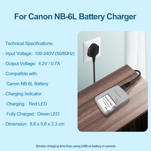 - NB-6LH Battery Charger Power – Input: AC100-240V/50-60Hz 0.25A, Output: 4.2V 0.7A. Provides a safe, fast and efficient charge for NB6L NB6LH battery, fit for travel, home or office, idea for great for travel photographers, vloggers and video photographer