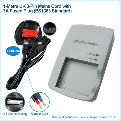 - BS1363-Certified UK Plug – Includes a 1-metre 3-pin UK mains cable with 3A fuse plug for stable, safe charging worldwide, and protection against short circuits, for Nikon NB-6L battery charger.