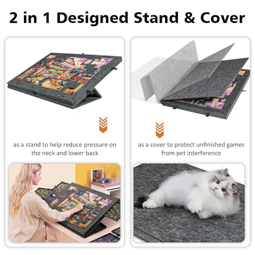 - 2-in-1 design: It can be laid flat on a table for comfortable puzzle play, or easily converted into a tilting puzzle board to effectively relieve neck and back pressure; as a protective cover, it can protect the puzzle from dust and pets