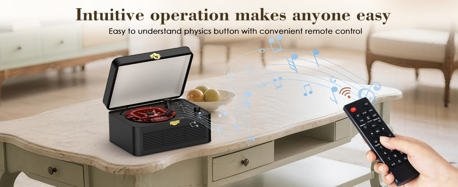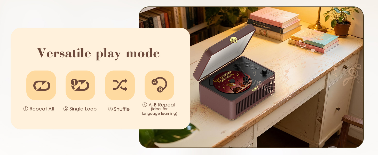- PU leather Design: Drawing inspiration from classic gramophones, this CD player features a PU leather design complete with a tone arm switch and transparent dust cover. Not only does it protect your CDs, but it also adds a better touch. The A-B repeat function is particularly suited to children's language learning and educational needs. Its distinctive aesthetic makes it an excellent gift for occasions such as birthdays, Christmas, or special events.
