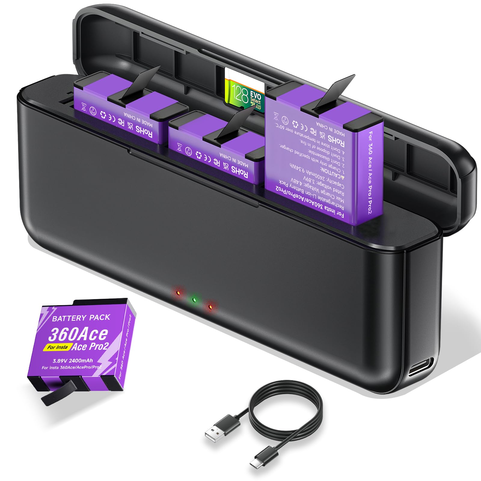 - 【Battery charger kit for 360 Ace / Ace Pro 】 Battery capacity: 2400mAh/9.34Wh. Voltage: 3.85V. Maximum charging voltage: 4.40V. | USB charger input: 5V/2.4A. Output: 4.2V 500mA*2. ⚡⚡⚡ Package contents: 1 x triple charger + 3 x rechargeable battery + 1 x Type-C cable