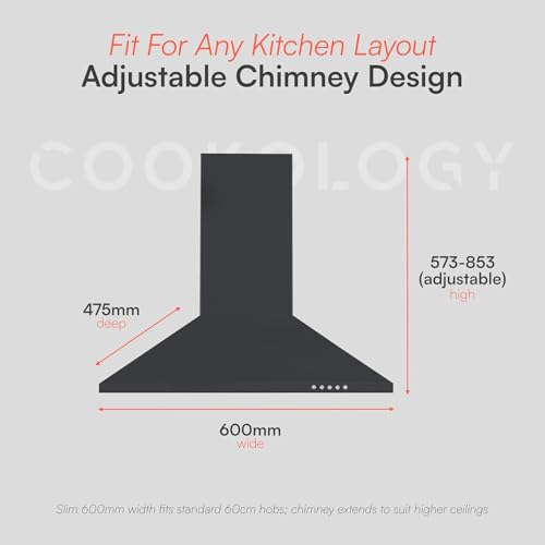 - ADJUSTABLE CHIMNEY HEIGHT: Designed for practicality, the chimney extends from 573mm to 853mm, allowing for flexible installation beneath various ceiling heights. Whether vented externally or used in recirculation mode, it’s simple to fit and perfectly suited to a wide range of kitchen layouts.