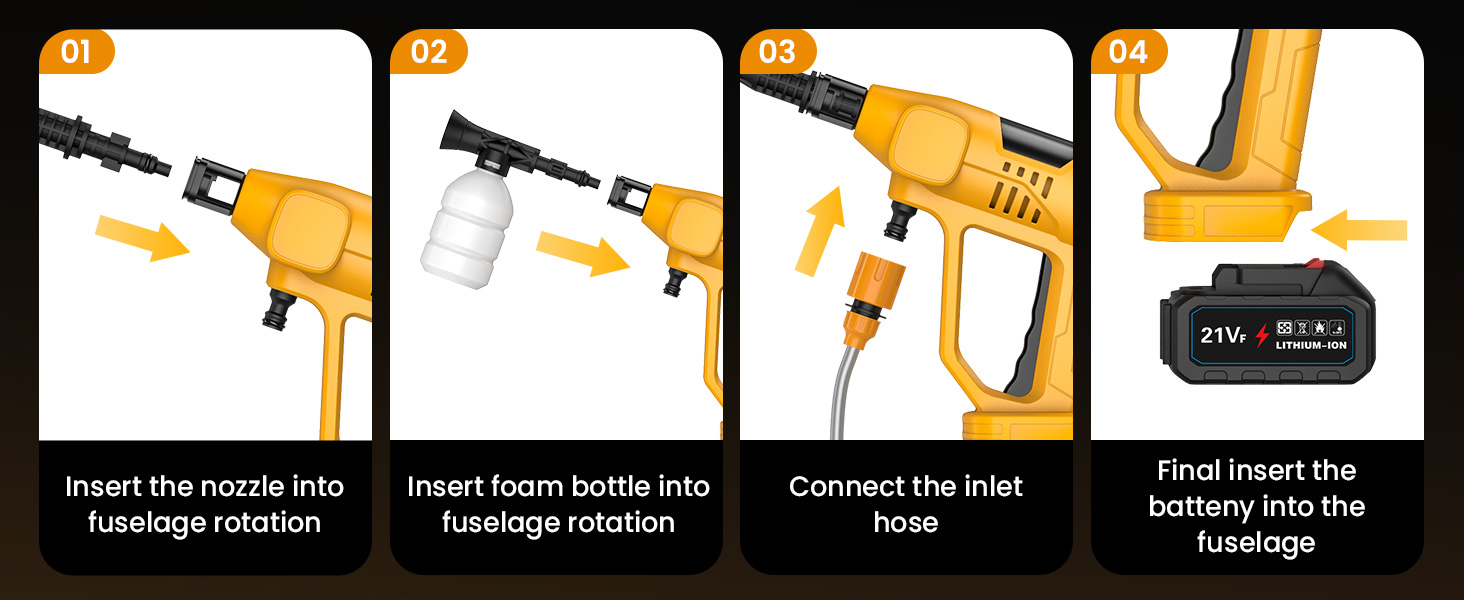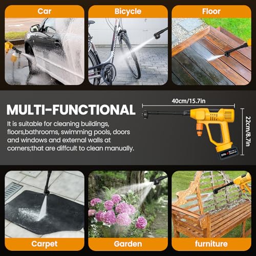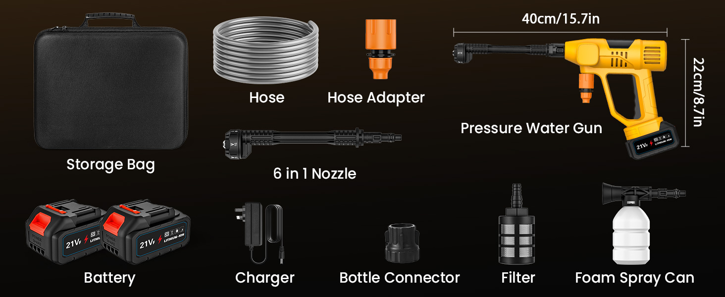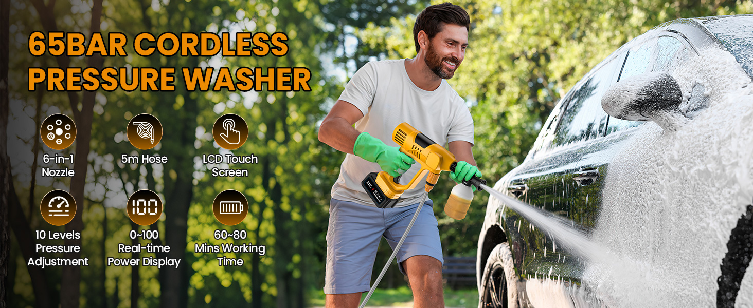 【Versatile 6-in-1 Nozzle & Foam Cannon】Equipped with a multifunctional 6-in-1 nozzle, simply rotate to select the perfect spray pattern (0°, 15°, 25°, 40°, 60°, and Shower mode) without needing to detach parts. Whether you are watering delicate plants or blasting mud off bicycle tyres, this cordless jet wash adapts instantly. The included foam pot creates rich lather, making car washing faster and more professional.