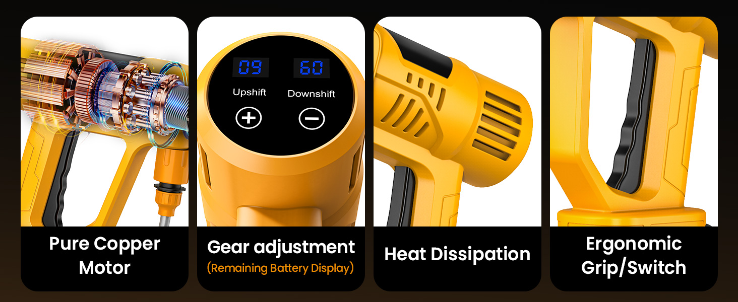 【Smart LCD Touch Screen & 10-Speed Control】 Unlike traditional button-operated washers, our upgraded cordless pressure washer features a sensitive LCD touch screen. You can easily switch between 10 pressure levels to suit different cleaning tasks, from gentle rinsing to deep cleaning. The digital display provides real-time monitoring of current pressure gear and remaining battery life, ensuring you are always in complete control of your cleaning progress without guesswork.