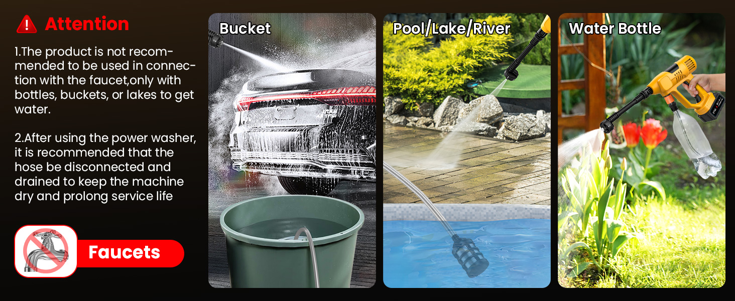 【Portable Design & Draw Water from Anywhere】Designed for convenience, this lightweight cordless power washer comes with a premium portable storage case. It supports dual water intake modes: you can connect it to a tap or use the included hose with a filter to draw water from buckets, pools, rivers, or bottles. Perfect for camping, balcony cleaning, or areas without a direct water supply. A true all-in-one solution for modern cleaning needs.