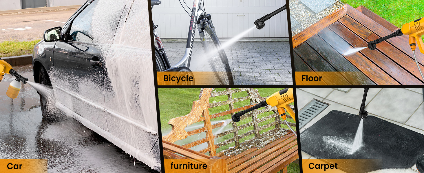 【Powerful 65 Bar Pressure & Deep Cleaning】Engineered with a high-performance motor, this portable pressure washer delivers a robust maximum working pressure of 65 Bar (approx. 940 PSI). It provides significantly stronger cleaning power than a standard garden hose, making it effortless to remove stubborn dirt, moss, and grime from cars, external walls, floors, and fences. It is the ideal heavy-duty jet wash for your daily household maintenance.