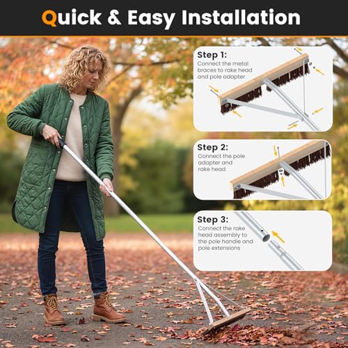 - Wide brush head with dense bristles clears leaves, pine needles, or dirt