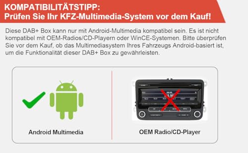 - ⭐️【Easy to use】If your Android car multimedia system has a pre-installed DAB+ app, simply purchase this USB-powered DAB+ box to receive digital radio. Otherwise, please contact us for assistance.