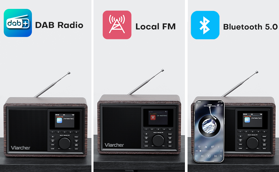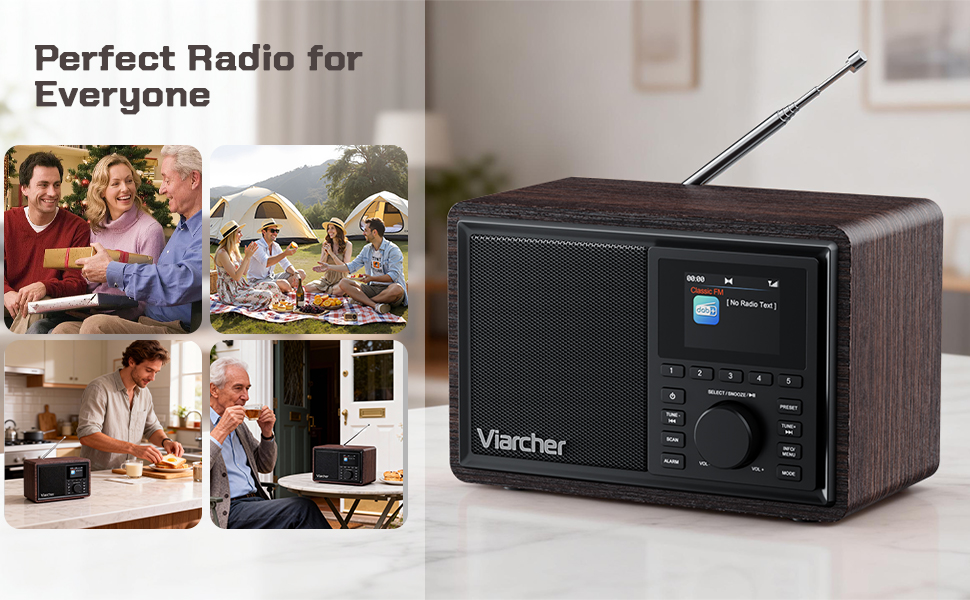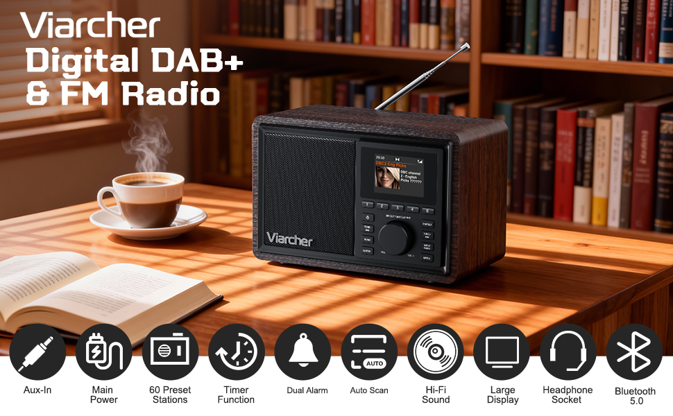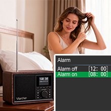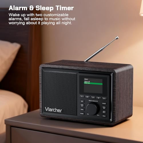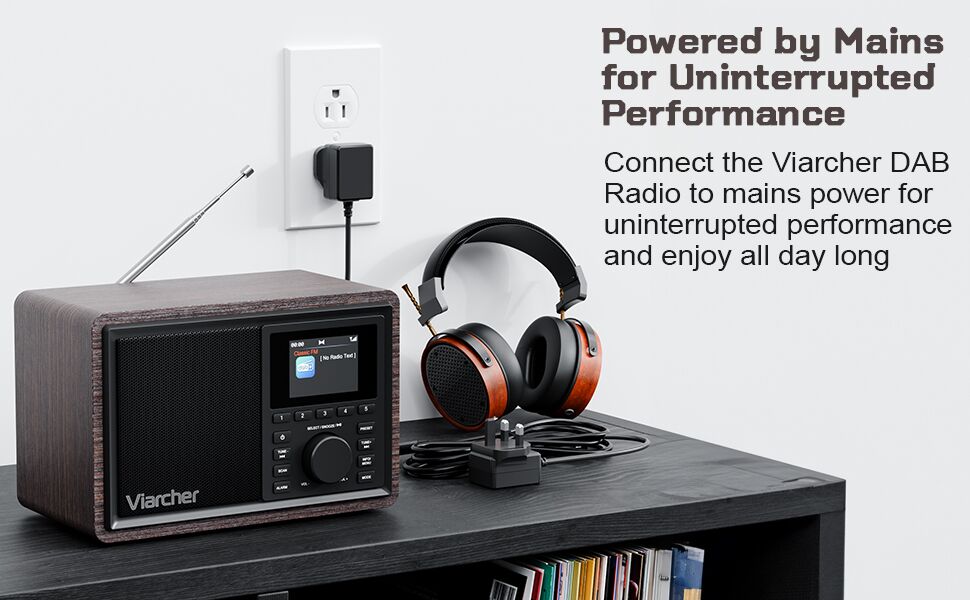 - 【Mains Powered DAB Radio with Dual Alarms/Sleep Timer】 The main powered DAB radio can be powered via the included DC 5V/1A power charger, perfect for use at home. Whether in the kitchen, garden, or bedroom, the retro and stylish design make the battery powered radio a perfect companion. Listen to your favorite stations, enjoy the ball game, the news, the weather or classic music. Wake up your way with two customizable alarms for weekdays or weekends, adjustable volume, and the choice of a buzzer or radio. Plus, the built-in sleep timer ensures you can fall asleep to music without worrying about it playing all night.