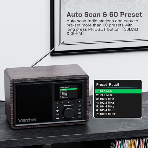 - 【60 Presets+Auto Scan+2.4" Large Colour LED Screen】 This retro radio makes it easy to use. Enjoy all of your favourite DAB / DAB+ and FM stations with superior quality sound, both fully automatic and manual station searches are possible. Easy set-up and quick Auto-Scan to search your favorite stations quickly, with 60 stations Presets to store and recall your favourite radio stations. 2.4" Large Colour LED Screen is convenient for selecting, easy to search, clear to get your favorite radio stations.